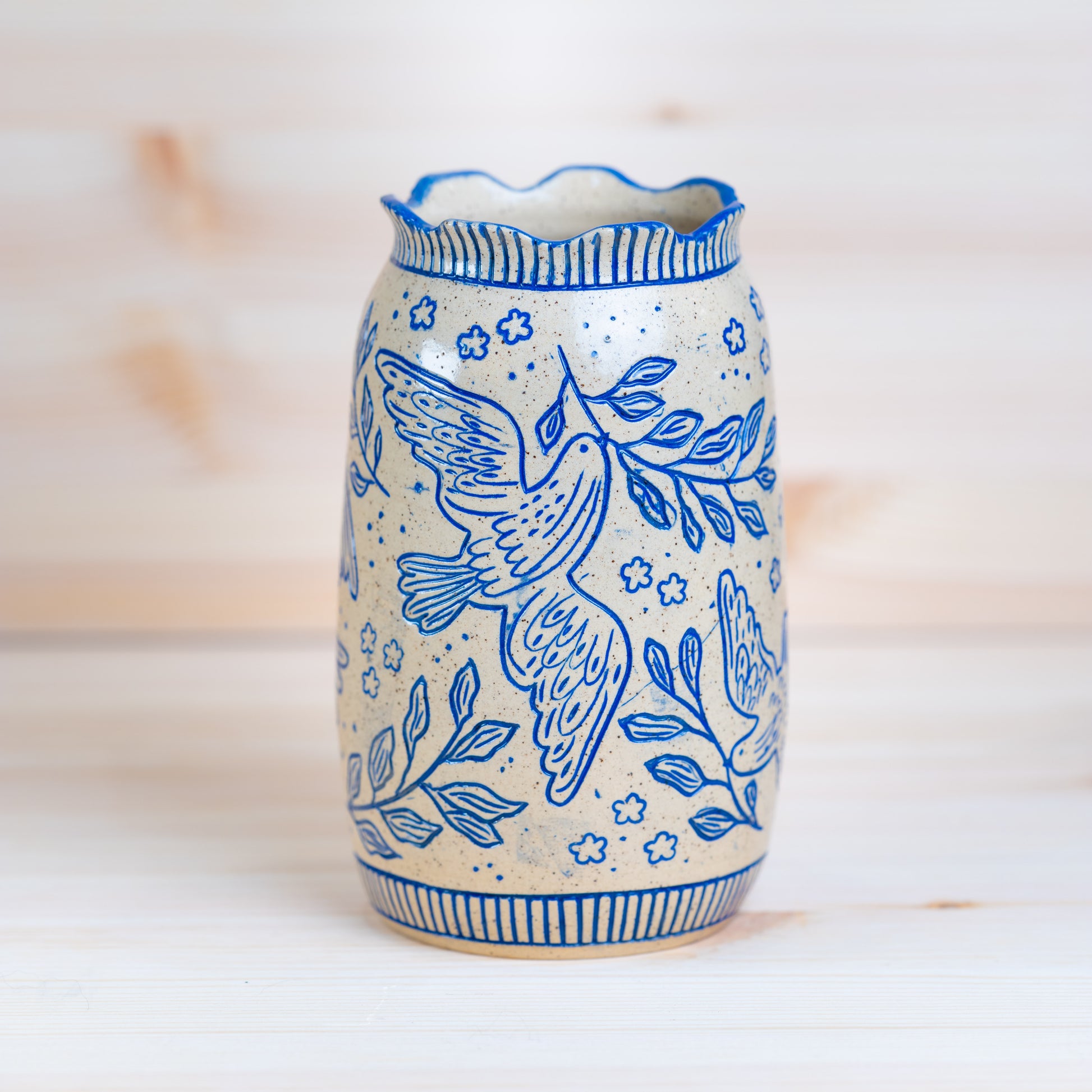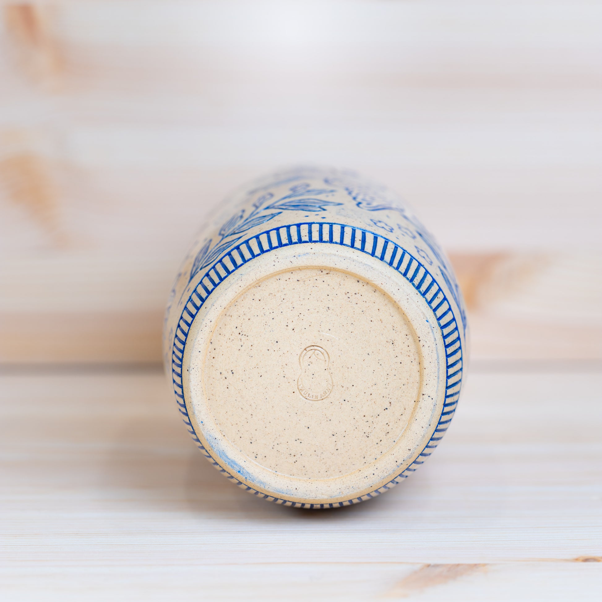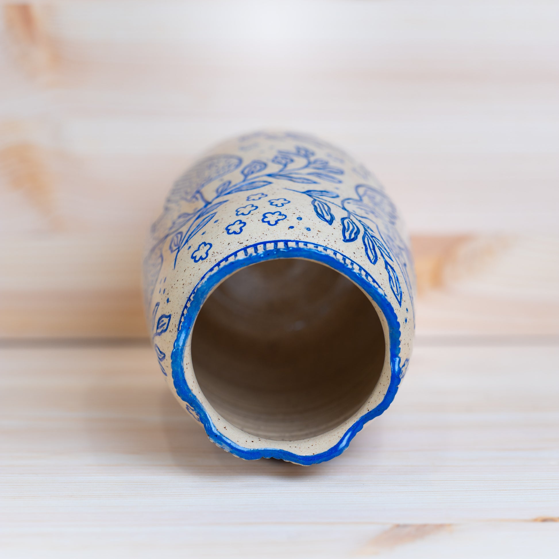 This vase is wheel-thrown from speckled clay and has a hand-carved Mishima-style design with a dark blue inlay. This vase is completely unique and crafted with care over many hours. Please note that due to the nature of handmade ceramics, there may be tiny imperfections in the clay and glaze.