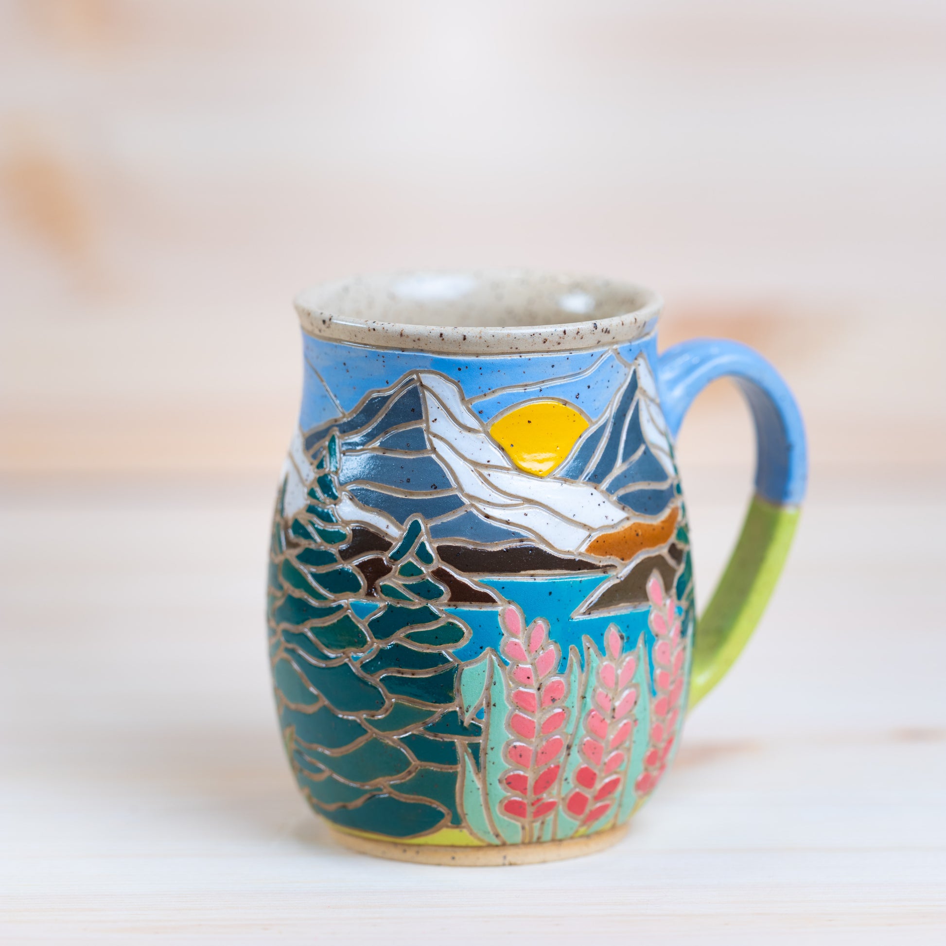 UThis mug is wheel-thrown from speckled clay and has a hand-painted, hand-carved design. Each mug is completely unique and crafted with care over many hours. Please note that due to the nature of handmade ceramics, there may be tiny imperfections in the clay and glaze.