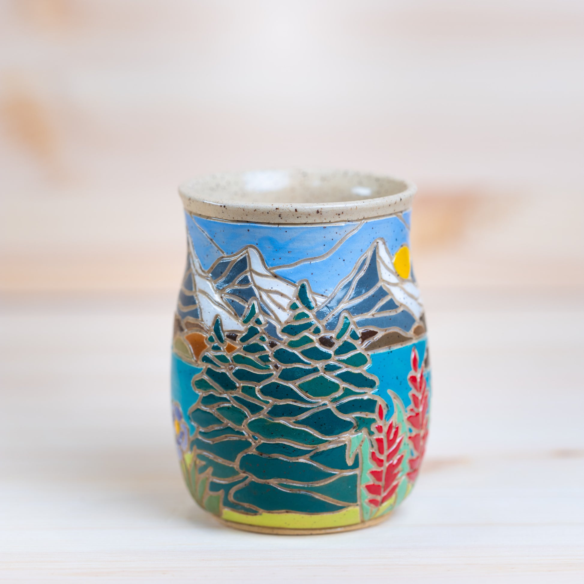 This mug is wheel-thrown from speckled clay and has a hand-painted, hand-carved design. Each mug is completely unique and crafted with care over many hours. Please note that due to the nature of handmade ceramics, there may be tiny imperfections in the clay and glaze.