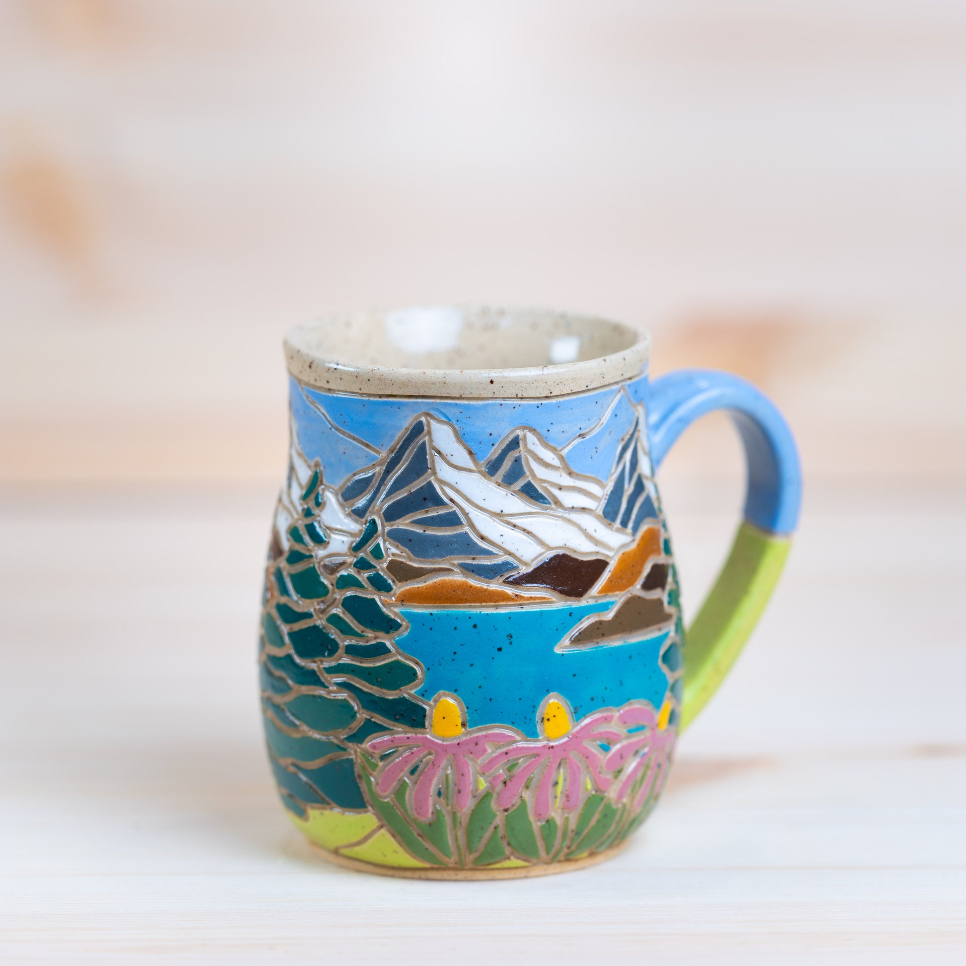 This mug is wheel-thrown from speckled clay and has a hand-painted, hand-carved design. Each mug is completely unique and crafted with care over many hours. Please note that due to the nature of handmade ceramics, there may be tiny imperfections in the clay and glaze.