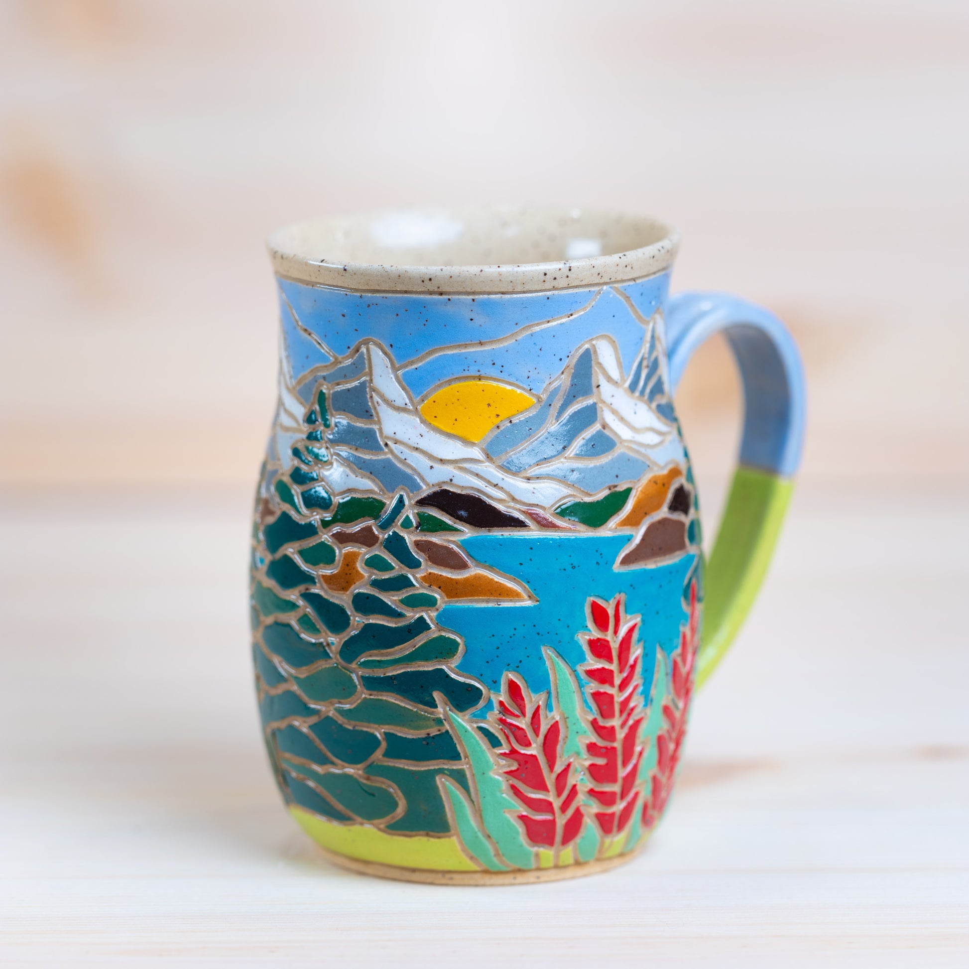 This mug is wheel-thrown from speckled clay and has a hand-painted, hand-carved design. Each mug is completely unique and crafted with care over many hours. Please note that due to the nature of handmade ceramics, there may be tiny imperfections in the clay and glaze.