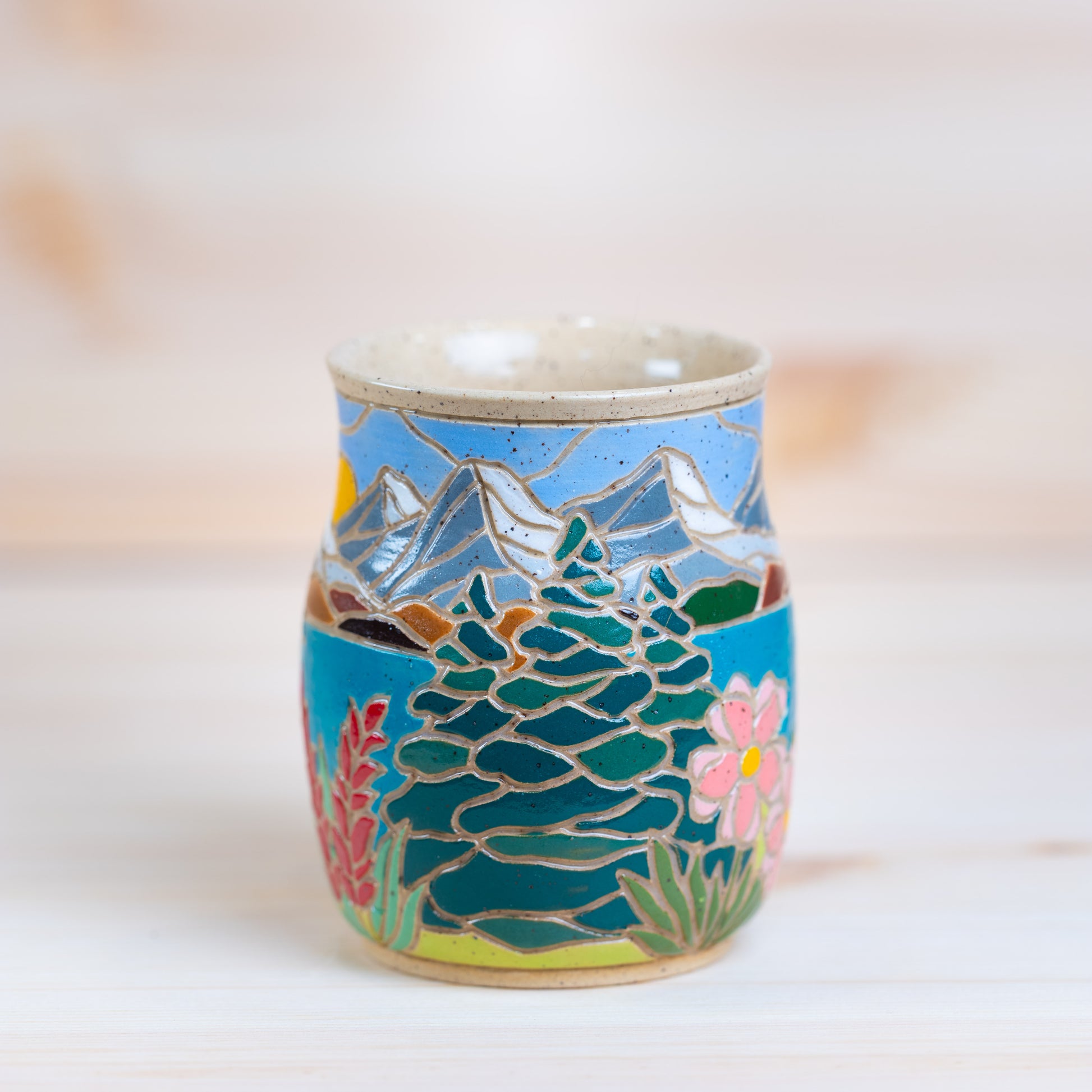 This mug is wheel-thrown from speckled clay and has a hand-painted, hand-carved design. Each mug is completely unique and crafted with care over many hours. Please note that due to the nature of handmade ceramics, there may be tiny imperfections in the clay and glaze.