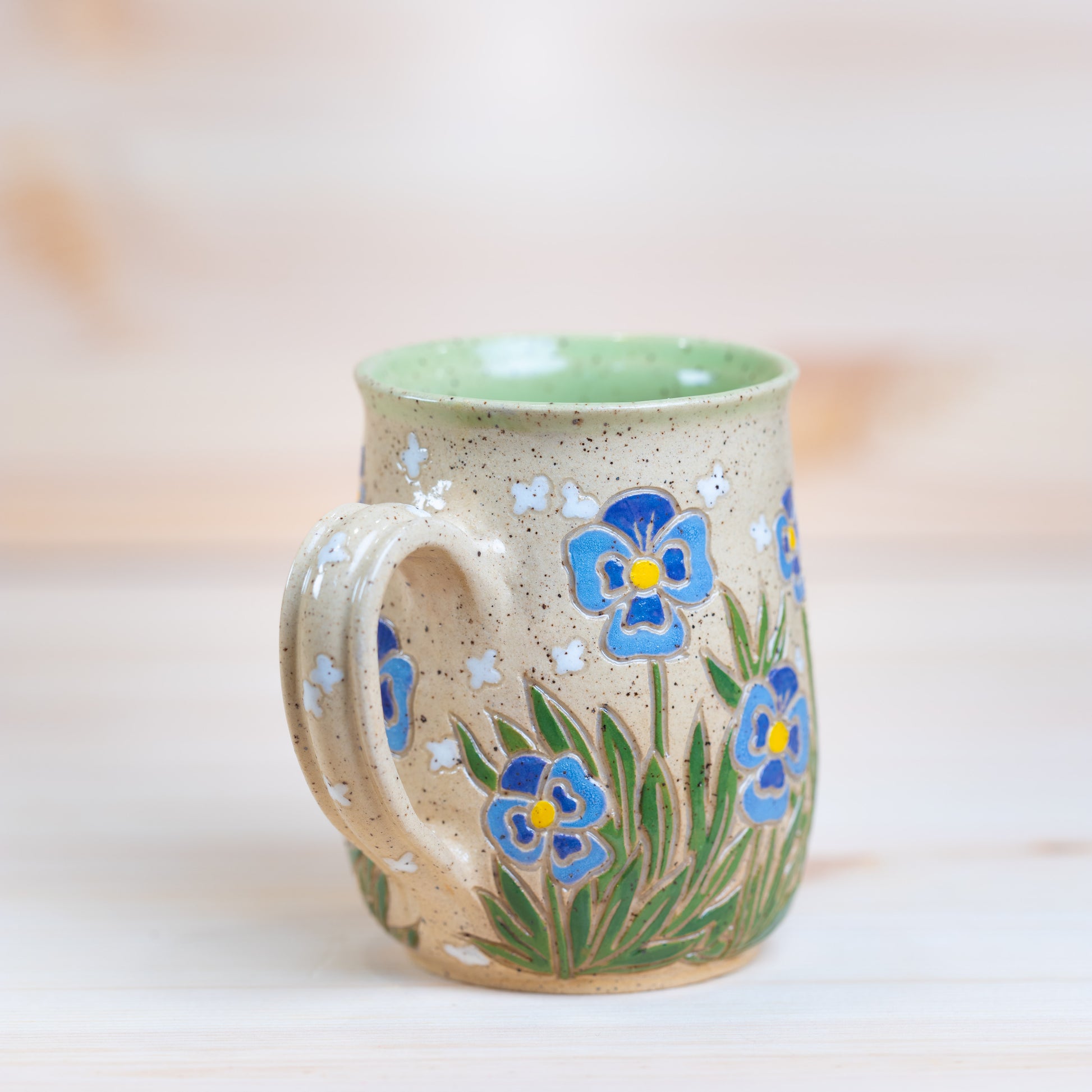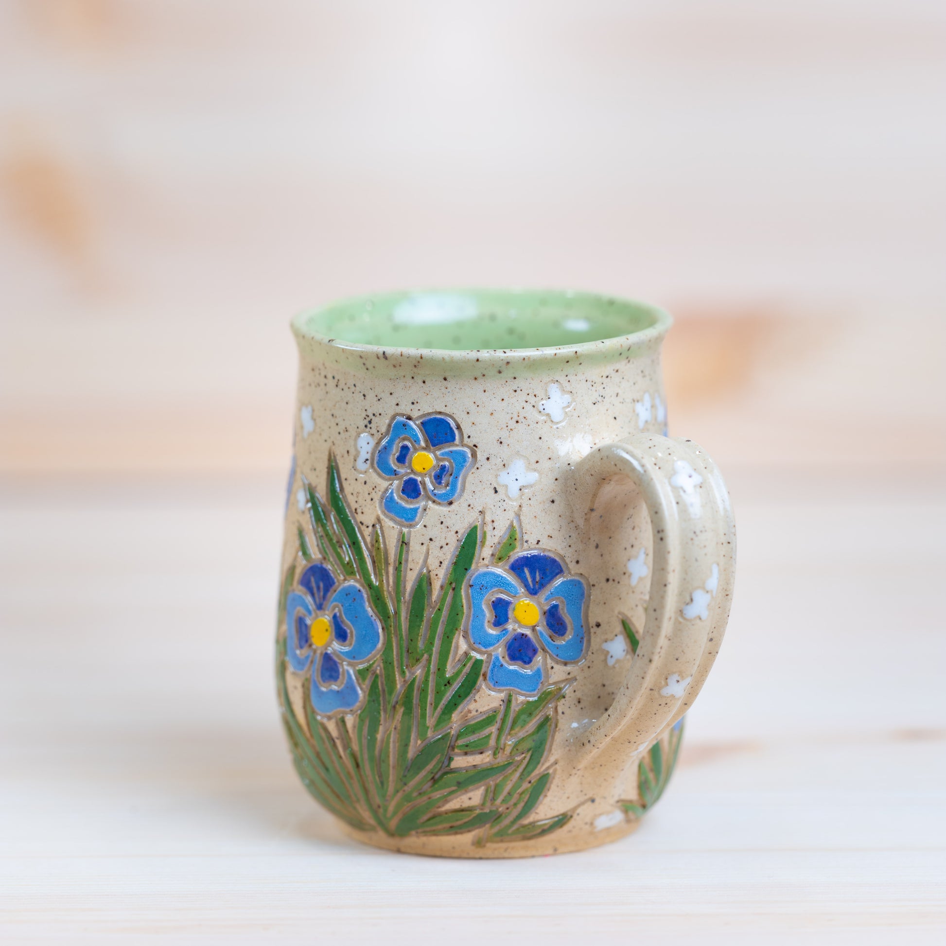 This mug is wheel-thrown from speckled clay and has a hand-painted, hand-carved design. Each mug is completely unique and crafted with care over many hours. Please note that due to the nature of handmade ceramics, there may be tiny imperfections in the clay and glaze.